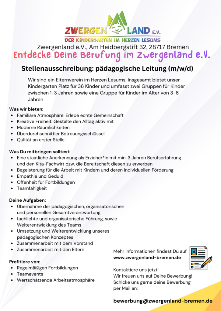 - Du kannst Dich gern direkt bei uns melden (bewerbung@zwergenland-bremen.de). Oder Du nutzt den Bewerbungsbogen auf der Homepage des Verbunds unter www.verbundbremerkindergruppen.de/freiwilligendienst