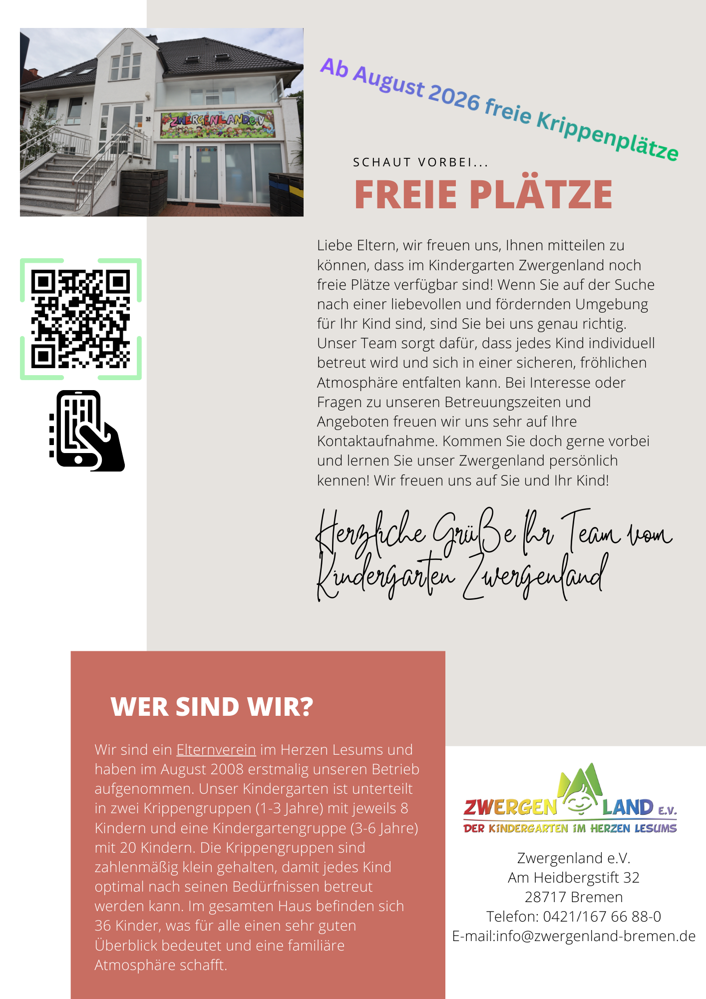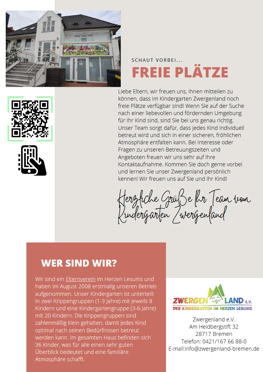 herzlich willkommen im Kindergarten Zwergenland e.V. Wir sind ein Elternverein im Herzen Lesums und haben im August 2008 erstmalig unseren Betrieb aufgenommen.